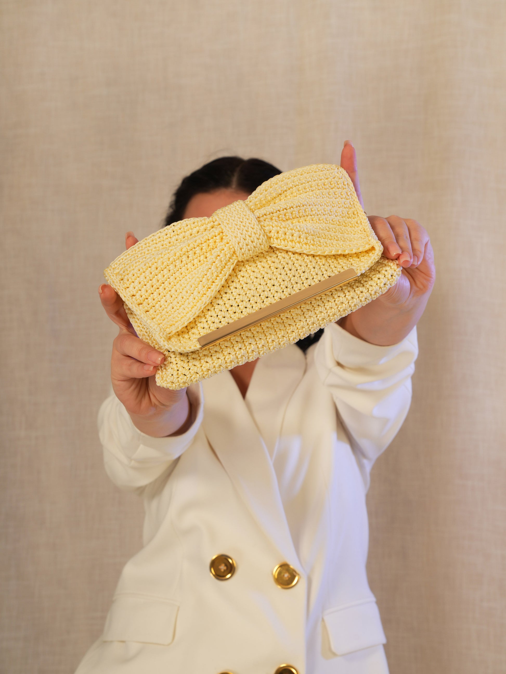 This clutch is crafted out of high-quality nylon yarn with a beautiful crochet pattern, which gives it a rich texture to the earthy tone of the clutch. A lovely bow decorated with slim metal detail takes this piece from traditional elegance to a modern classic. The Beige Bow Clutch is an ideal accessory for a casual brunch or an evening event - it's versatile, stylish, and easy to wow the crowd.
