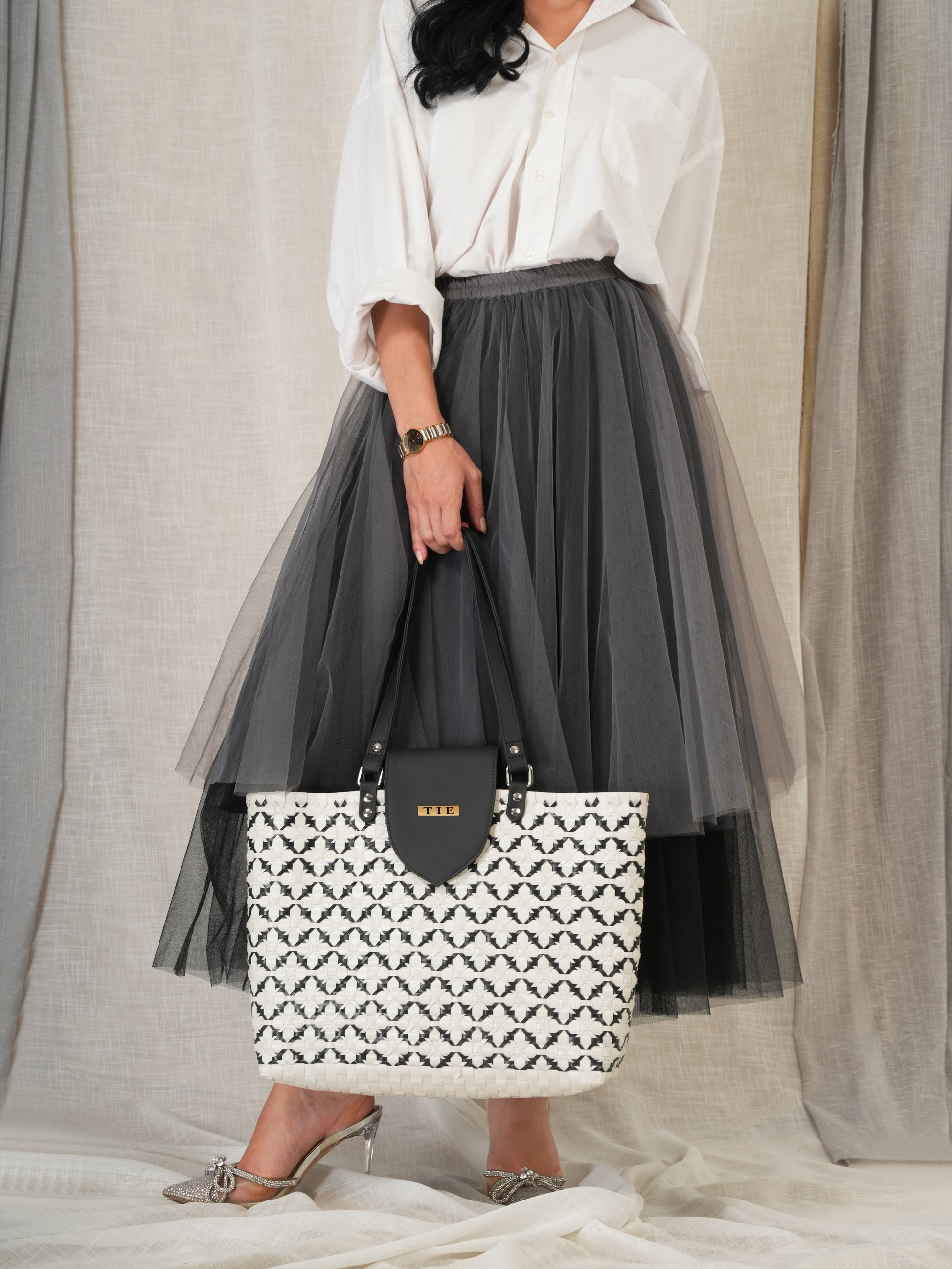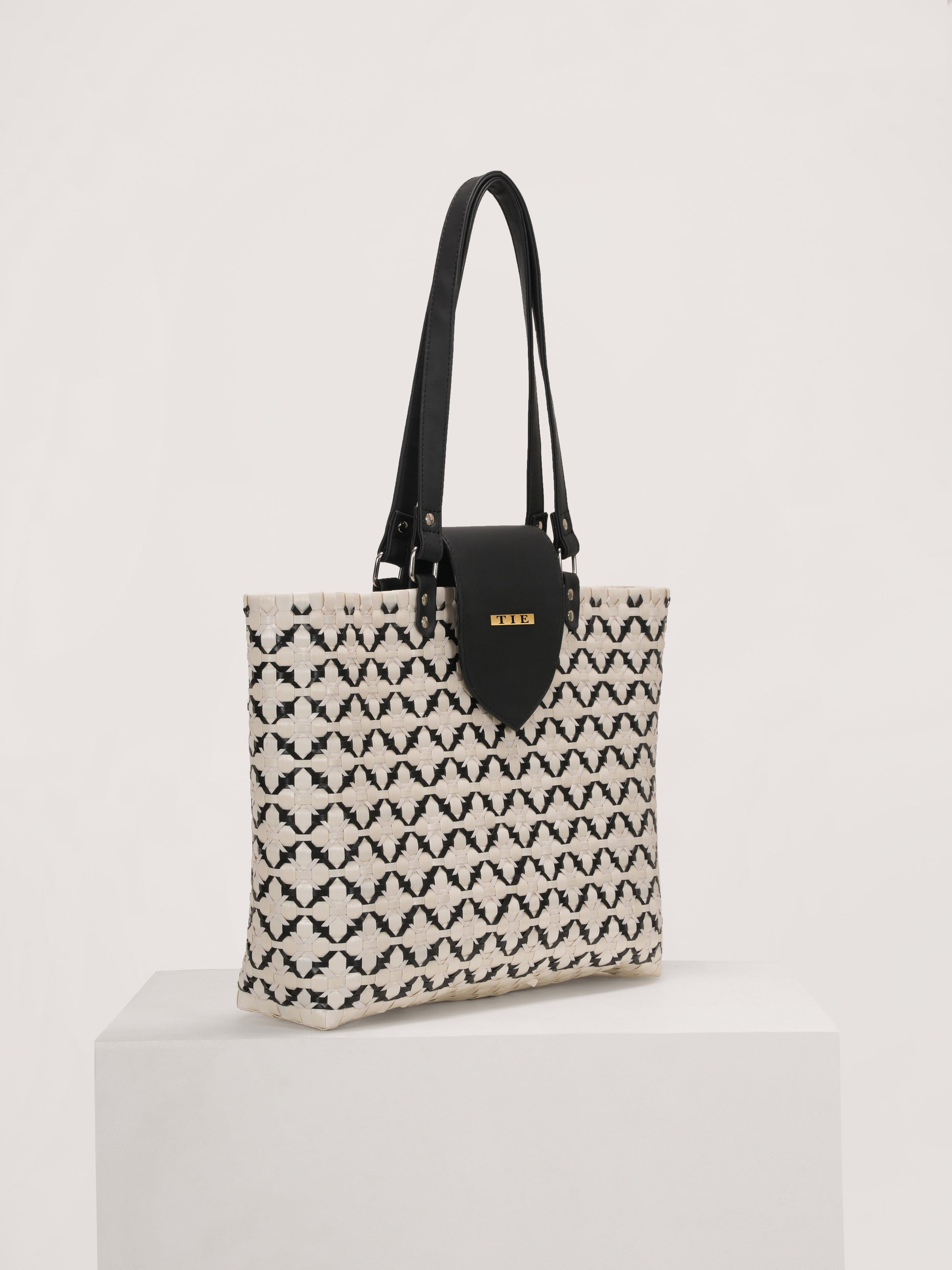 This Classic Chettinad White Tote bag is meticulously hand-woven from plastic tape wires and smooth vegan leather handles. The craftsmanship and bold black and white weave give the Chettinad Tote a unique artisan quality, while the spacious interior helps to keep your day in check: laptop, books, touch-up essentials, water bottle, and more. Lightweight and durable, structured yet resilient, it is an all-day bag that works just as hard as you do.